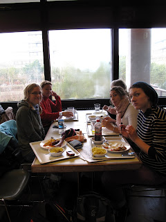 Etter en rundføring til de klasserommene vi skal være mesteparten av tida i, dro vi av gårde til byen for å finne en kafé vi kunne sette oss litt ned på før vi skulle videre. Da vi skulle gå av bussen, åpna ikke bussjåføren dørene bak der de fleste av oss sto, men Targeir kom seg greit ut foran. Greia var til slutt at vi ikke i det hele tatt kom oss ut og måtte vente til neste stoppested. Som den smarte gutten han er, fant han oss igjen mindre enn ett minutt etterpå, og vi gikk samla inn for å få gitt noen sultne mager litt føde.
